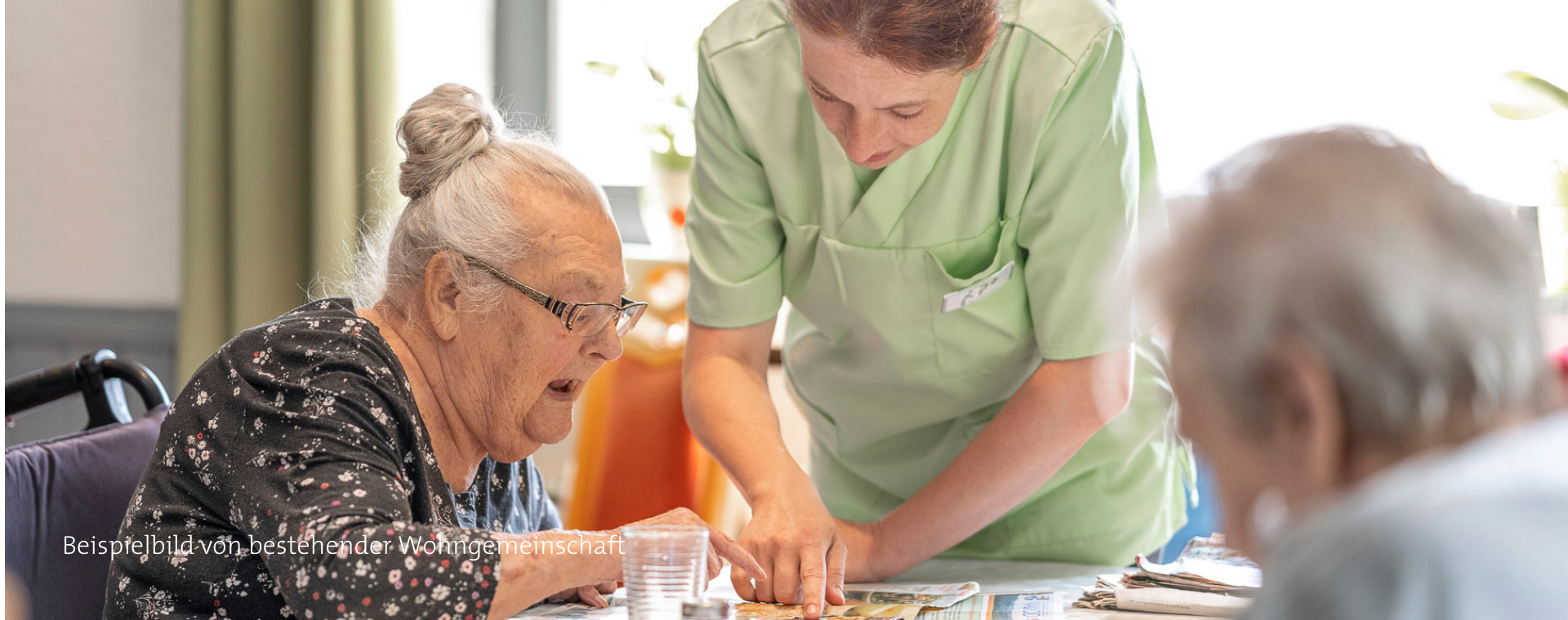 Die Wohngemeinschaft erstreckt sich über das Dachgeschoss und den Spitzboden und bietet acht Bewohner*innen Platz. Jeweils zwei Senior*innen teilen sich ein Bad, wodurch eine persönliche und gleichzeitig vertraute Wohnstruktur entsteht. Die Einzelzimmer können individuell gestaltet werden und bieten Raum für Rückzug und persönliche Erinnerungsstücke.
